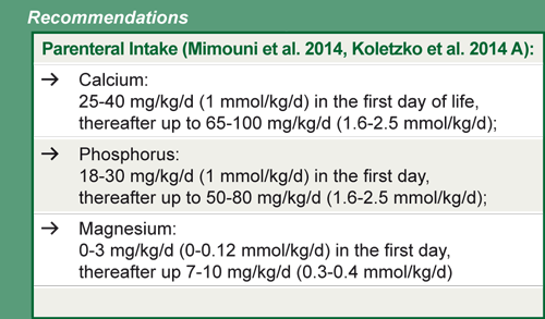 Yaşamlarının ilk günlerinden itibaren besinlerinin büyük bir kısmını intravenöz yoldan aldıkları için parenteral beslenme ÇDDK bebeklerde çok önemlidir. Tam enteral beslenmeye geçişin başarılması doğumdan sonra birkaç hafta alabilir. Parenteral mineral takviyede ideal takviye hesaplanırken parenteral çözeltilerdeki tuz mineraliinin çözünürlüğünün iyi olmadığı göz önünde bulundurulmalıdır. Buna ek olarak, erken doğan bebeklerde doğum sırasında hipokalsemi ve hipofosfatemi yaygındır. Bu nedenle, bu besin maddelerinin doğumdan hemen sonra parenteral yoldan yeterli miktarda tedarik edilmesi önem taşır (Mimouni et al. 2014).