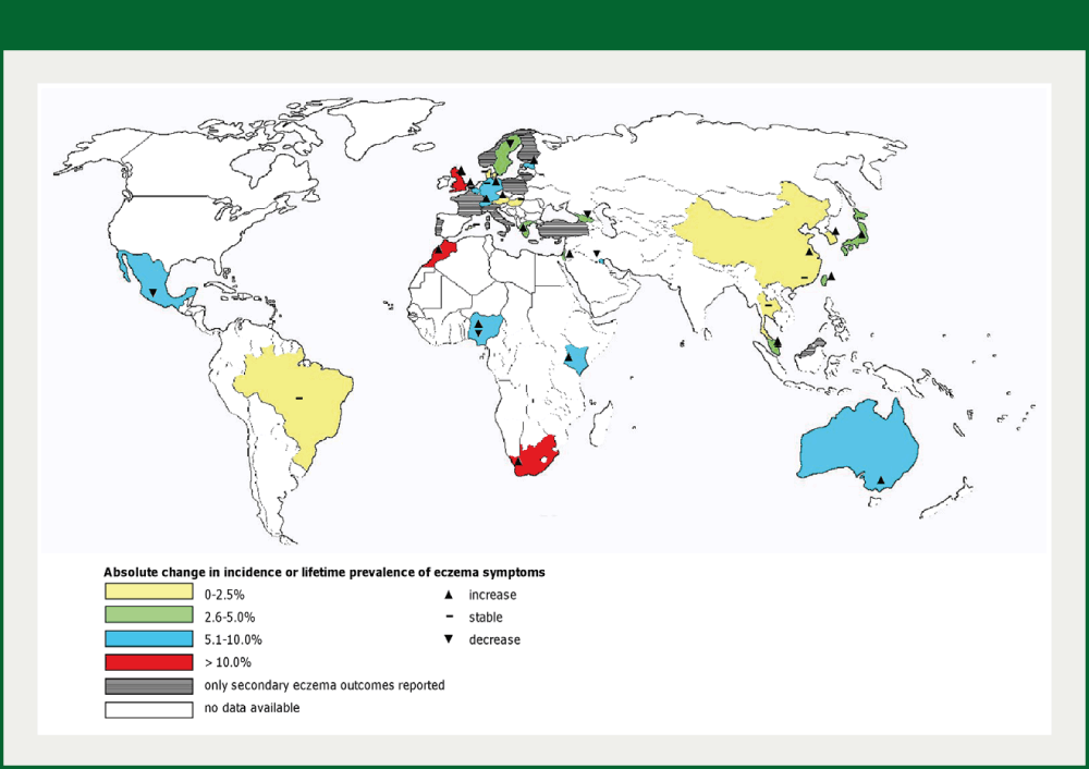 Figure 5: World map of the incidence and lifetime prevalence of atopic eczema symptoms (1990-2010).