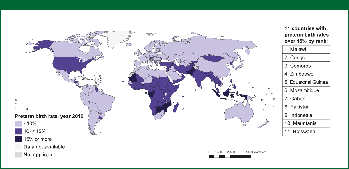 In 2012 the WHO published "Born Too Soon: The Global Action Report on Preterm Birth" with global statistics on preterm birth and suggested approaches to address this enormous public health problem (WHO et al. 2012). Despite medical progress, the rate of preterm birth is rising in most countries and ranges from 5-18% of all births, an estimated 15 million babies each year. Preterm birth is the leading cause of death among infants under 4 weeks of age. Many of these deaths would be preventable, even without advanced technology or expensive treatments. The rates of preterm birth across countries are quite varied (Figure 1), with areas in sub-Saharan Africa and Southern Asia showing the highest regional rates of preterm birth (WHO et al. 2012).