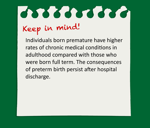 Recently, a number of studies have demonstrated that prematurity increases the risk of certain diseases and conditions later in life, such as diabetes (Tinnion et al. 2014, Hofman et al. 2004), hypothyroidism (Crump et al. 2011), high blood pressure (Sipola-Leppanen et al. 2015), even obesity (Mathai et al. 2013) and psychosocial challenges (Mannisto et al. 2015). A large Swedish cohort study has demonstrated that a low gestational age at birth was independently linked to increased mortality in early childhood and young adulthood (Crump et al. 2011a).