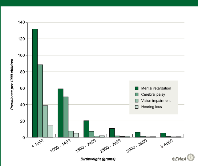 Figure 4 below shows the inverse relationship of birthweight to prevalence of certain disabilities in preterm birth survivors.