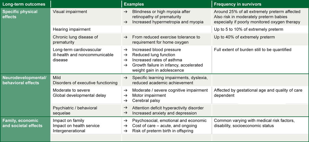 Clearly, preterm birth presents a major public health issue. The most direct approach to the problem, addressed in the WHO "Global Action Report on Preterm Birth" (WHO et al. 2012), is to take measures to decrease the incidence of preterm birth through targeted prenatal care. The next step is to improve survival of infants born prematurely. And the final step, beyond survival, is improvement of the long-term health of these infants as they grow up.