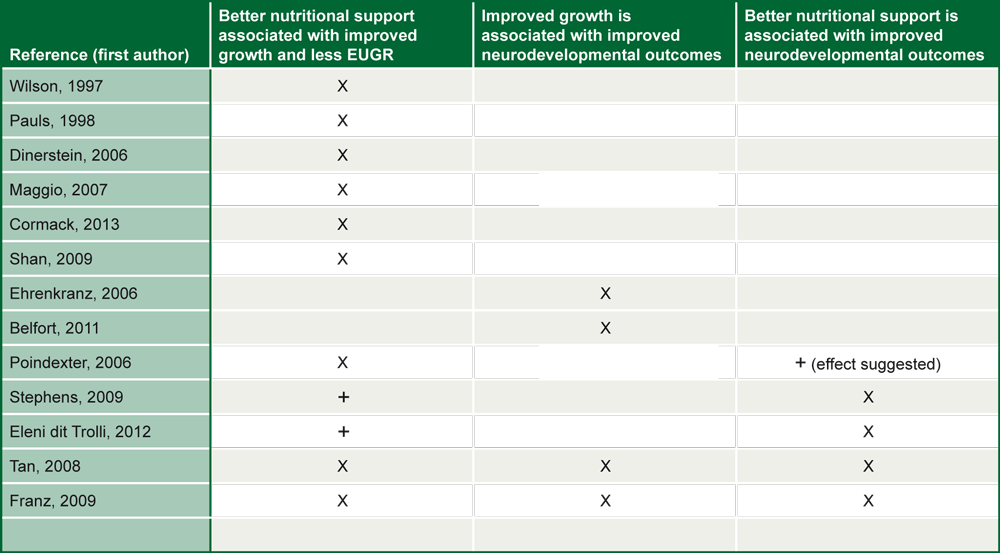 Optimal nutrition in the NICU aims to achieve a satisfactory functional development of the infant. While the preterm infant is in the NICU, the main goal of the NICU team is actually to provide enough nutrition comparable to that the infant should have received in the womb. However, most infants in the NICU gain less weight than fetuses in utero. As a result, a large number of the infants exhibit extrauterine growth restriction (EUGR), and this subnormal growth often persists into early childhood and even later. A number of clinical studies published in the past years demonstrated a positive relationship between nutritional intervention in the NICU and growth and neurodevelopment outcomes (see table 3).