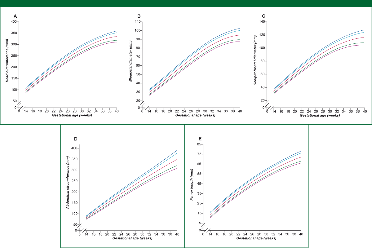 Legend: Fetal head circumference (A), fetal biparietal diameter (B), fetal occipitofrontal diameter (C), fetal abdominal circumference (D), and fetal femur length (E) measured by ultrasound according to gestational age.